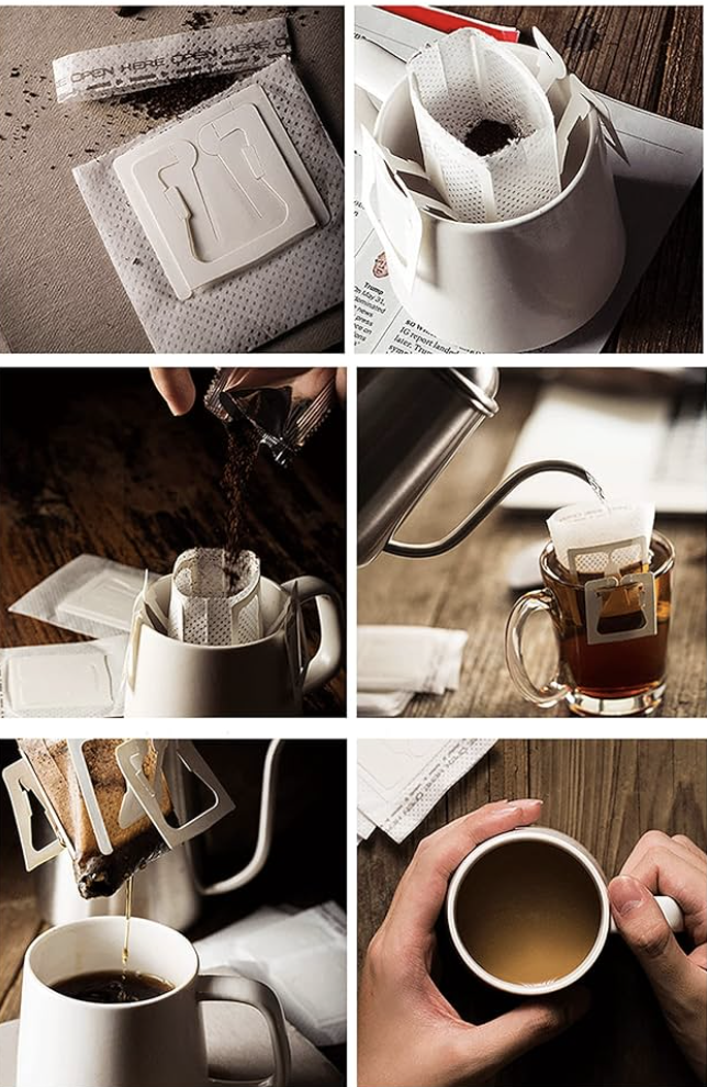 SS Instructions Tear Open the filter expand over the mug add your coffee and slowly pour over your hot/warm water.